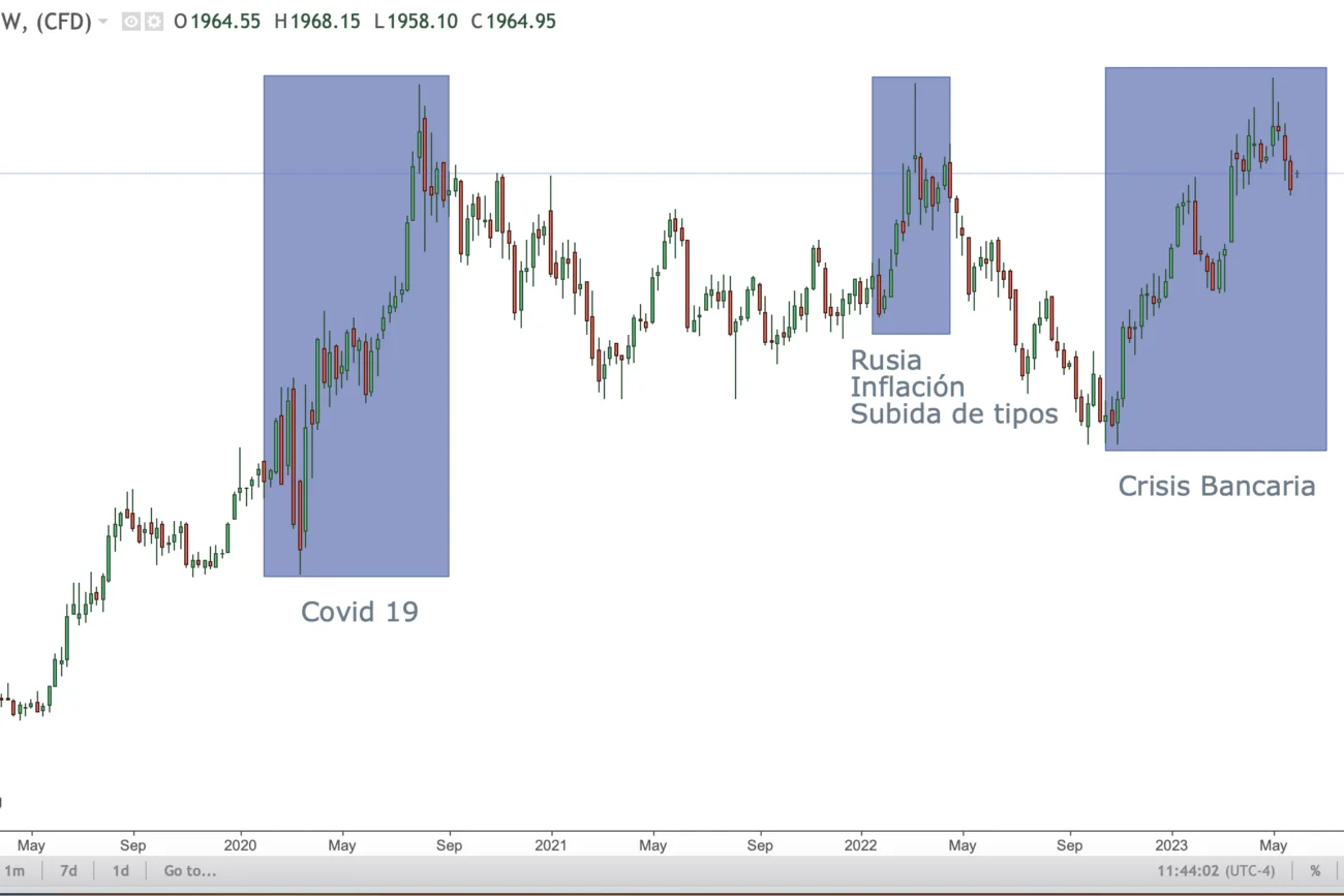 A diferencia del petróleo, no podemos gestionar las caídas del oro, solo podemos gestionar las subidas, puesto que ante mares revueltos su comportamiento será al alza. Pero lo hace una manera muy peculiar, cuando hay un ambiente de pesimismo en las bolsas, el oro baja, pero cuando ya han descontado dicha caída, el oro subirá. O así lo hace históricamente, por lo que imagínate un caso real, en el año 2022, cuando si inicia la guerra y empiezan a caer los índices, el oro subía, cuando a mitad de año, habíamos normalizado desgraciadamente la guerra y la inflación y además habíamos normalizado las subidas de tipo, el oro empezó a caer. Debemos de aprovechar esa primera subida de cuando el asunto se complica, al inicio del cisne negro.