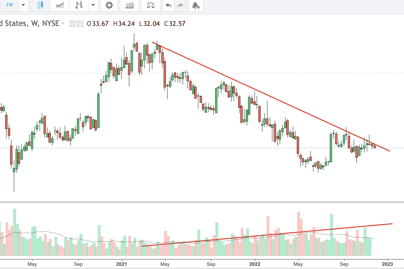 Pero a la hora de tomar una decisión, por ejemplo en este caso de compra del valor UBER, el cual ni soy inversor ni estoy haciendo ninguna recomendación de compra. Es probable que en las próximas semanas haya un cambio de tendencia puesto que, el valor no deja de caer, sin embargo, como vemos en el volumen cada vez hay más gente en la plaza.