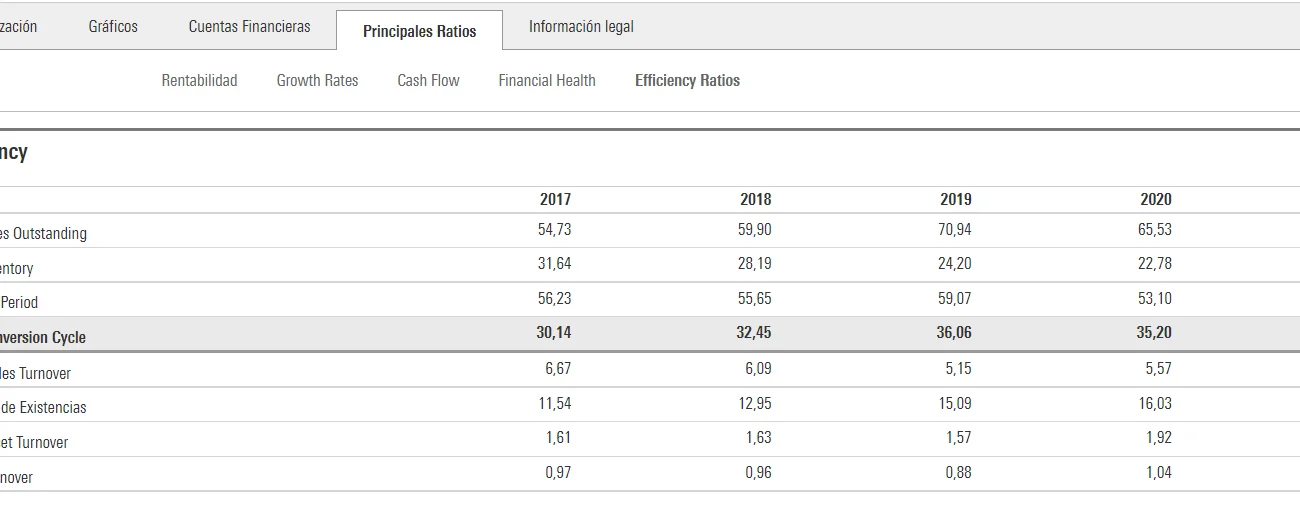 En cuanto a la eficiencia financiera los datos a resaltar es que mantiene resaltar un cobro medio por la venta de productos y servicios de menos de 60 días. Aproximadamente tarda un mes en convertir sus productos en líquido, que es un buen ratio.
