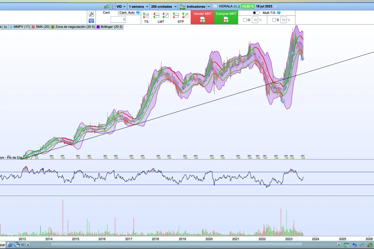 Puesto que si está el valor en un rango situado por la parte baja, después de hacer un análisis del largo plazo, apreciar que está en un soporte, si yo quería entrar en ese valor, puesto que conozco sus flujos de caja, su deuda a que se dedica el negocio etc… ese sería el mejor momento para entrar, los mejores ejemplos fueron Vidrala y Rovi